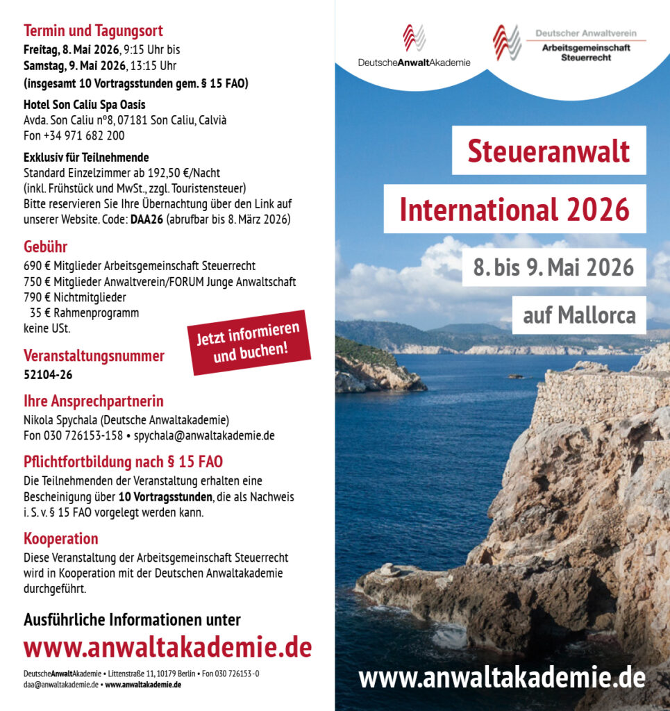 Diese Veranstaltung der Arbeitsgemeinschaft Steuerrecht im Deutschen Anwaltverein e. V. wird in Kooperation mit der Deutschen Anwaltakademie durchgeführt.