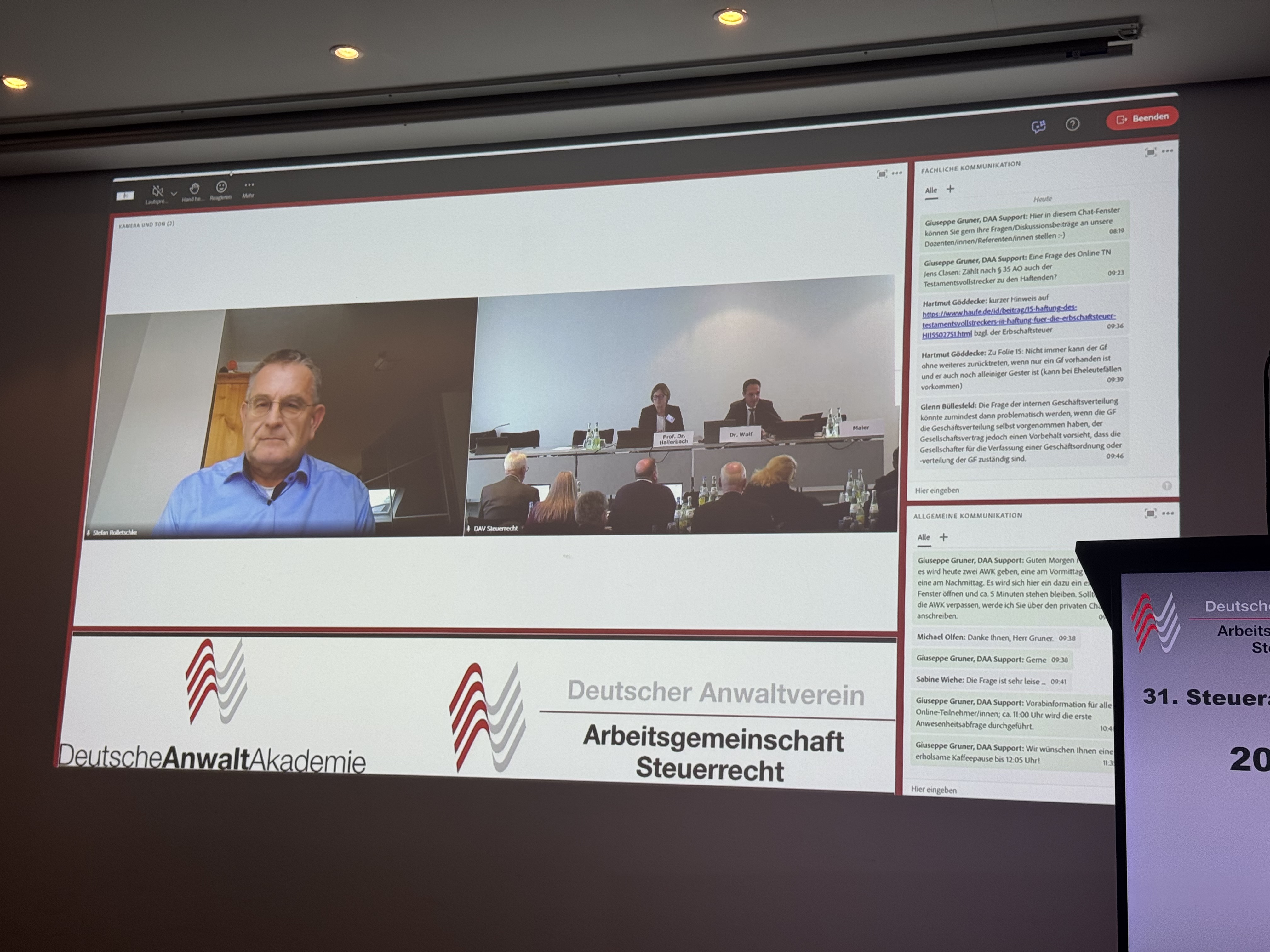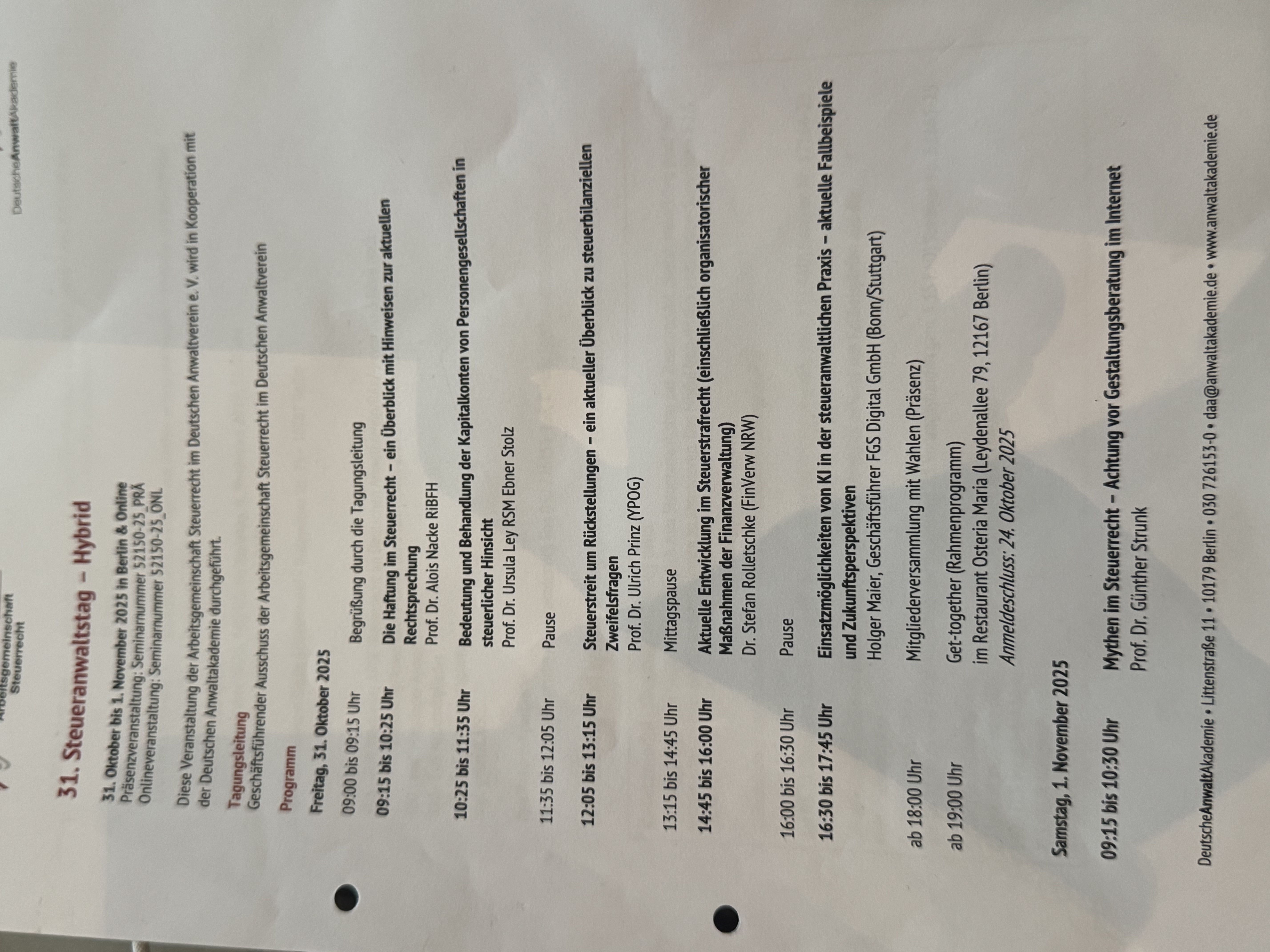 mit einem abwechslungsreichen Programm findet die Jahrestagung der Arbeitsgemeinschaft Steuerrecht aktuell wieder im Hotel Pullmann Berlin Schweizerhof statt. Namhafte Referenten aus der Finanzverwaltung, der Justiz und der Beraterschaft kamen und kommen heute und morgen zu Wort.